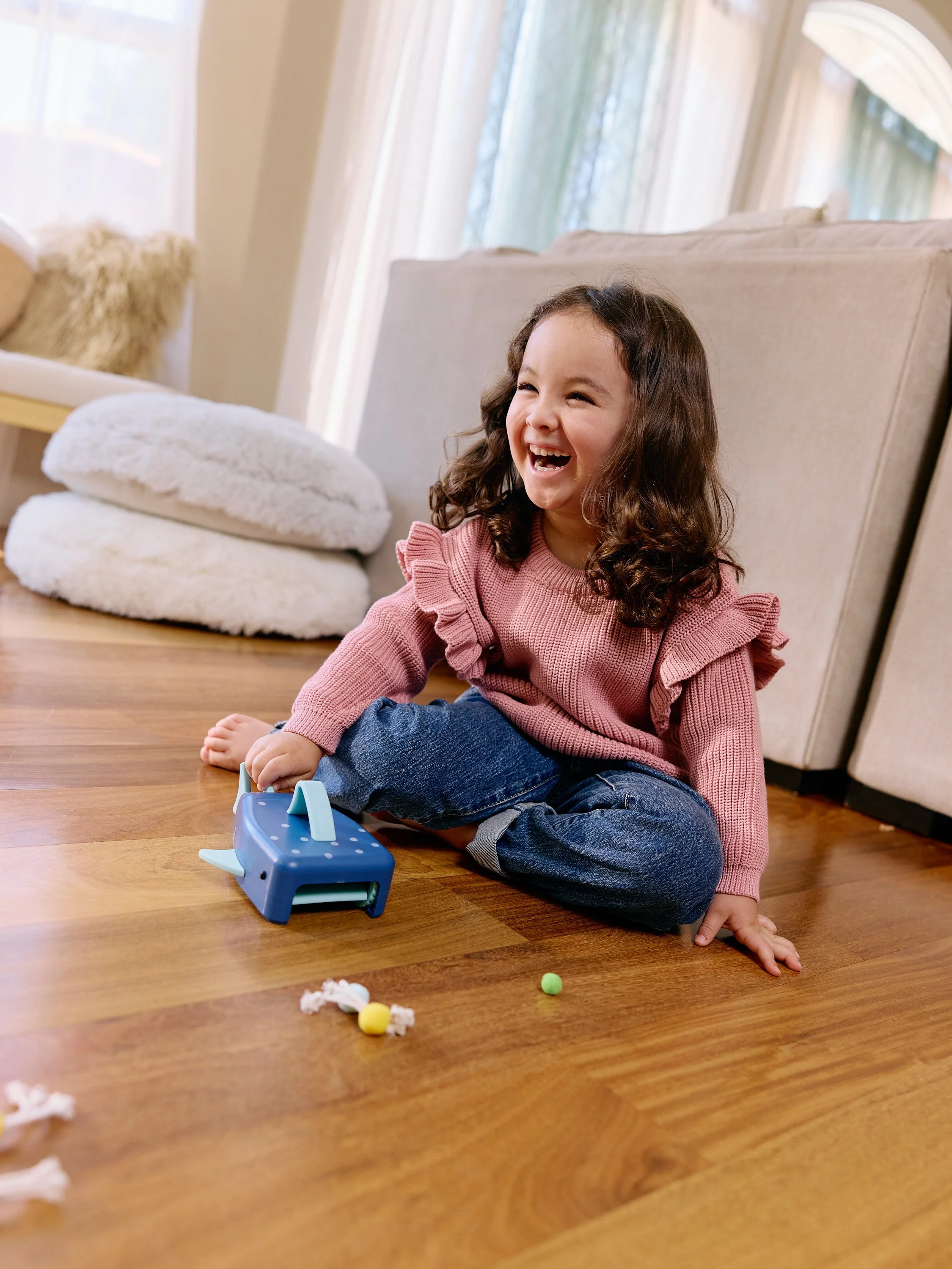 A young girl with curly brown hair, wearing a pink sweater and blue jeans, sitting on a hardwood floor indoors. She is smiling and holding a toy stapler in the air. There are small green pom-poms on the floor in front of her, and a cream-colored couc View fullsize